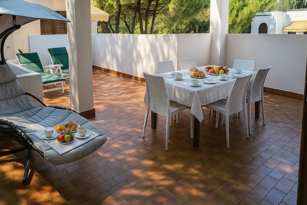 Genießen Sie Ihre Terrasse mit Sonnenliegen und Essbereich: Frühstück in der Sonne, Nachmittagsruhe oder gemütliche Abendessen unter freiem Himmel – alles nur wenige Schritte vom Strand entfernt